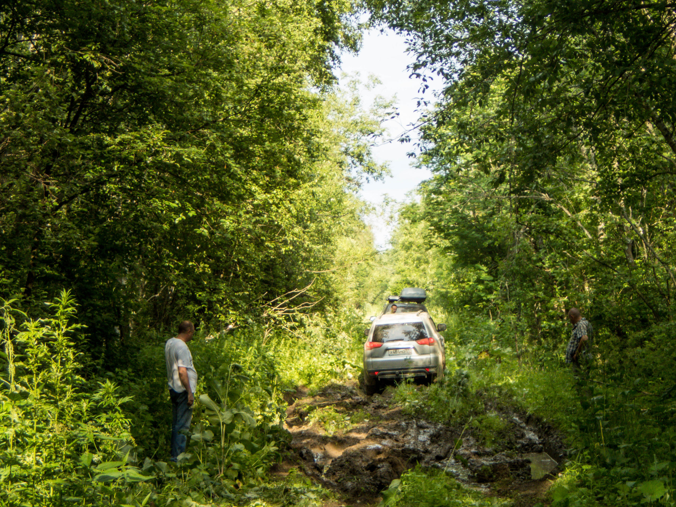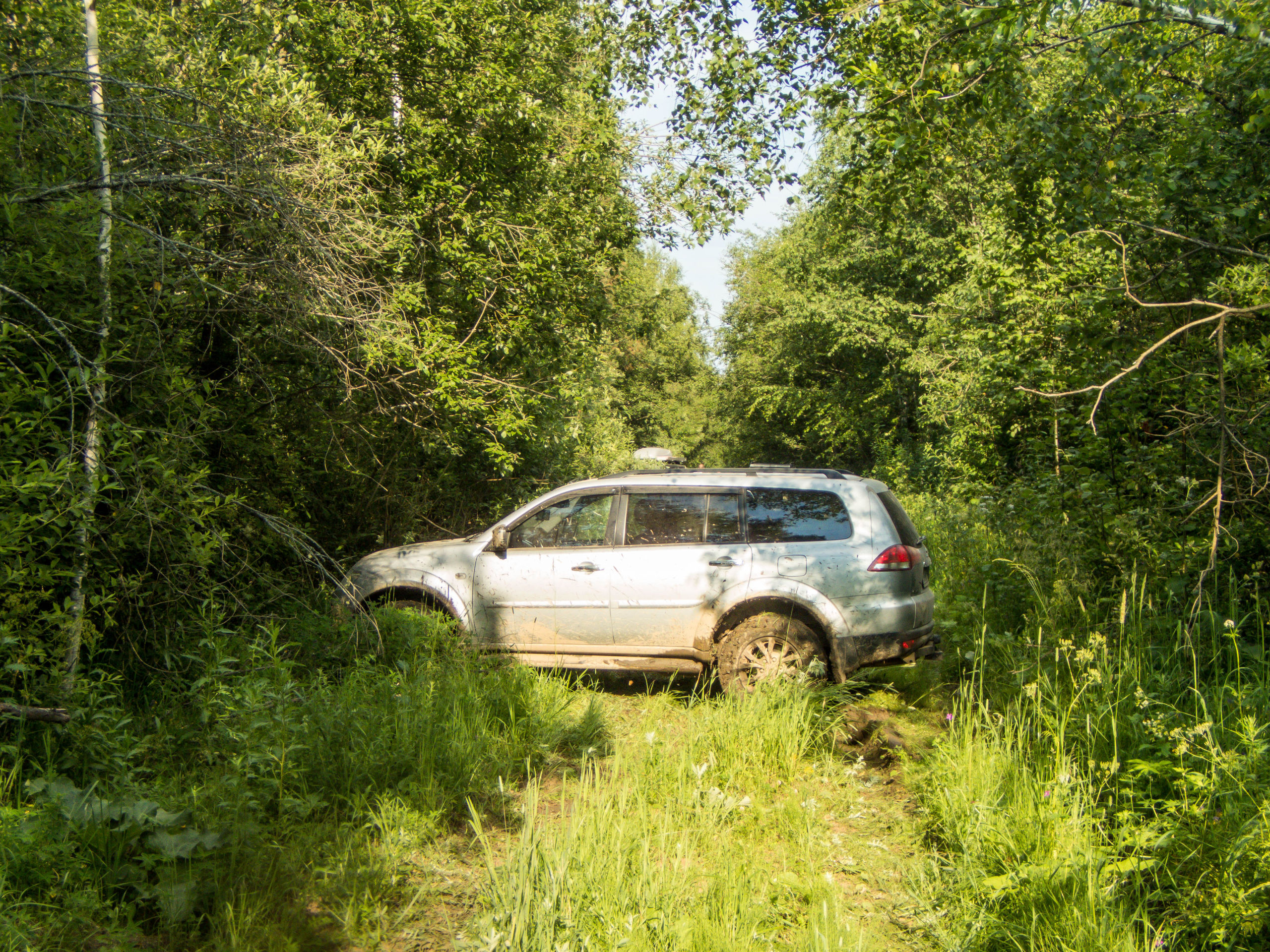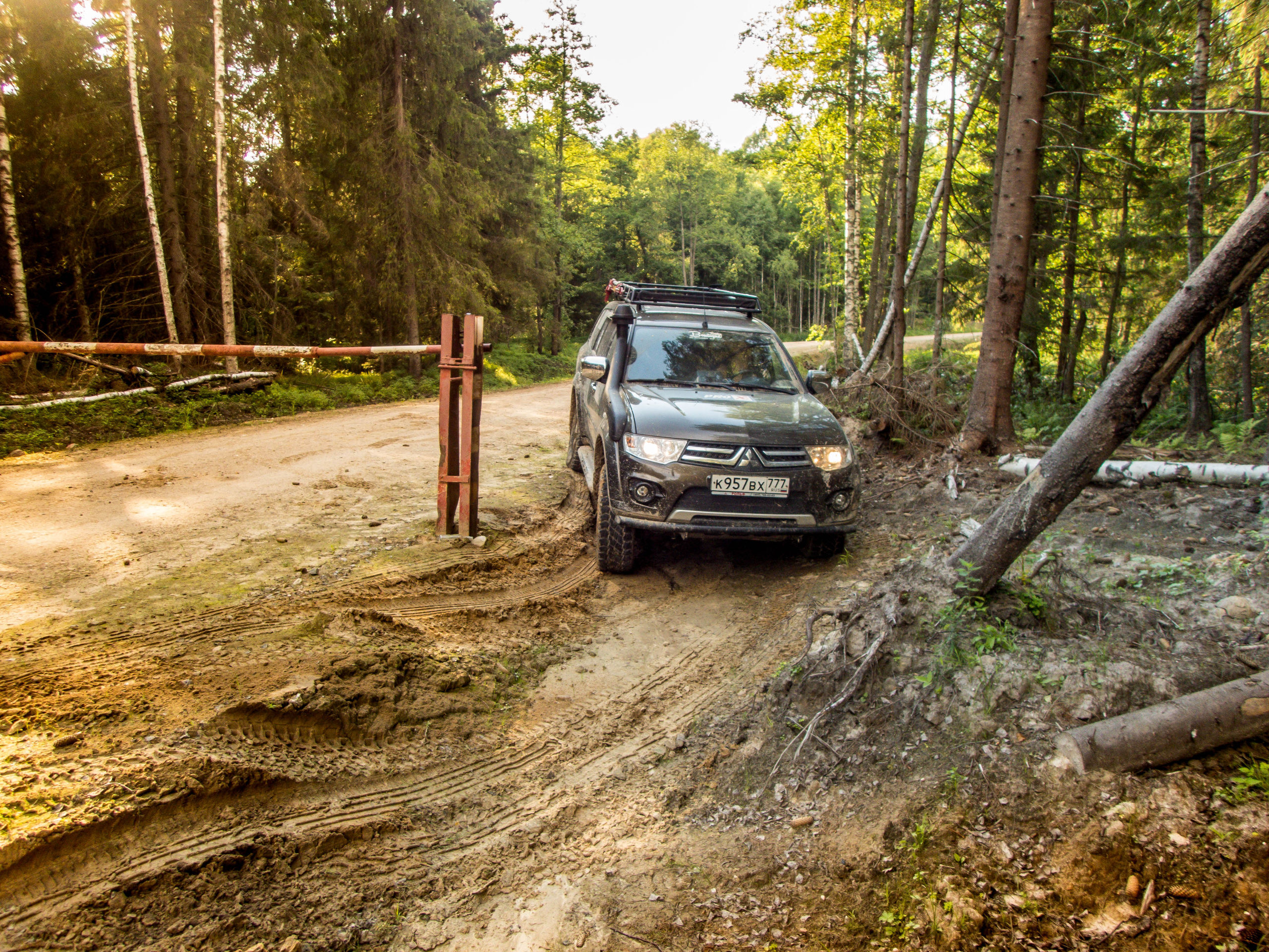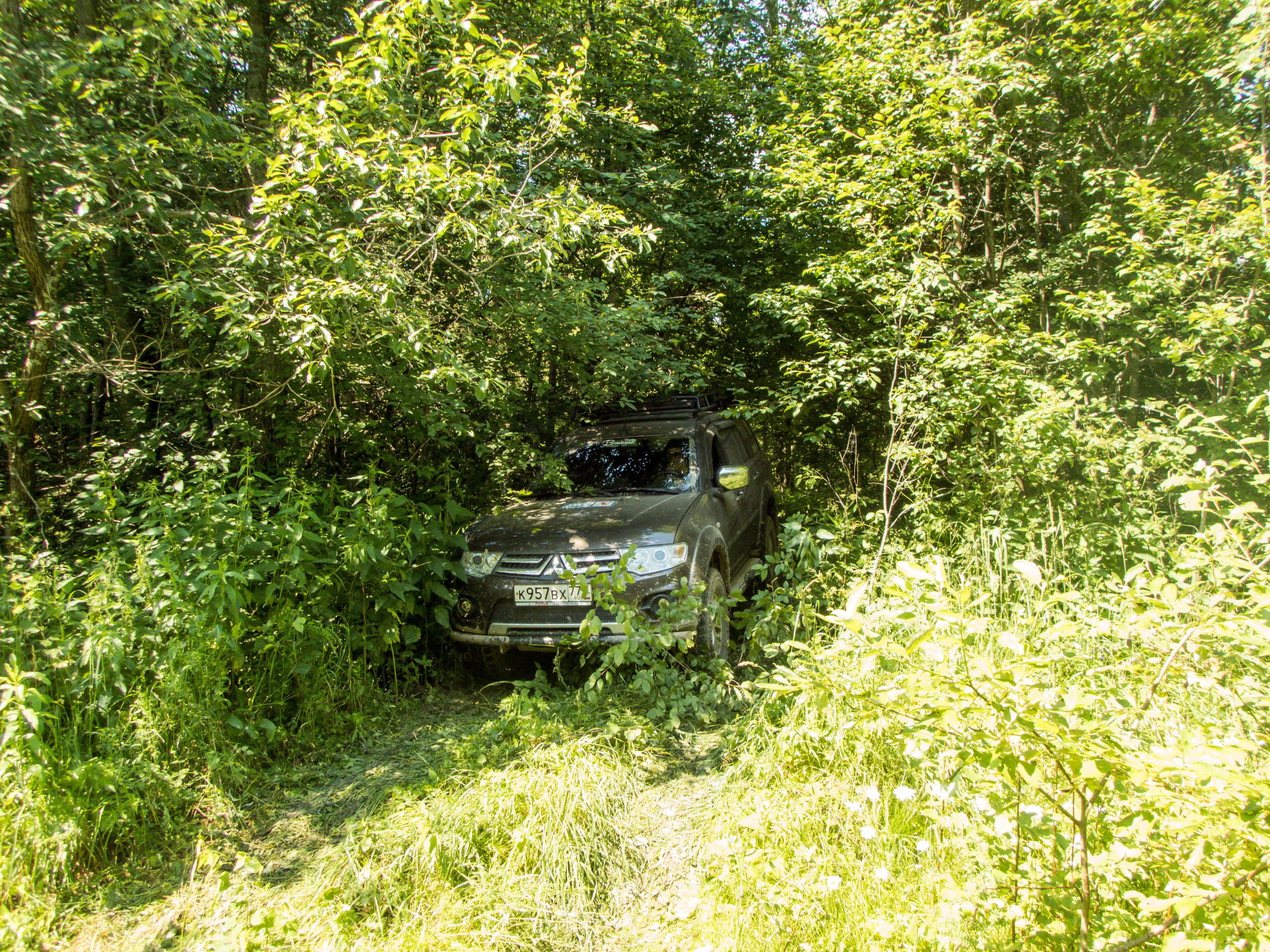 После ручья немного расслабились на грунтовке и чуть не сделали «уши» на ровном месте. Хорошо облокотились на деревья багажником на крыше. А дальше аккуратненько вернулись на дорогу.