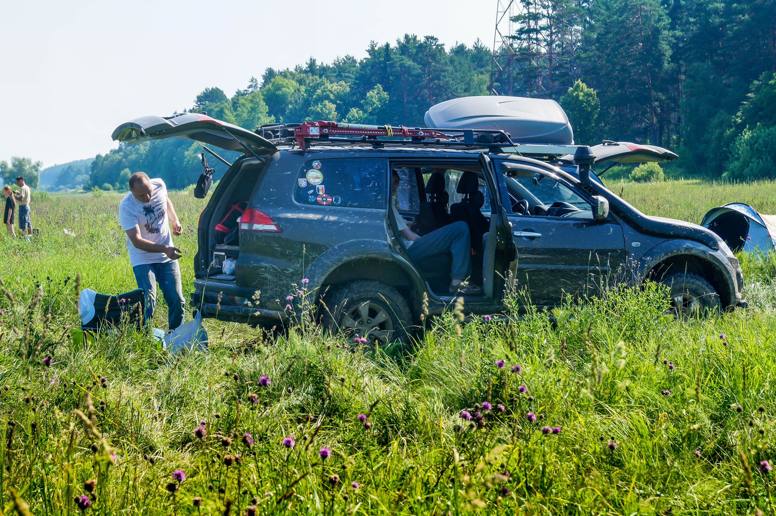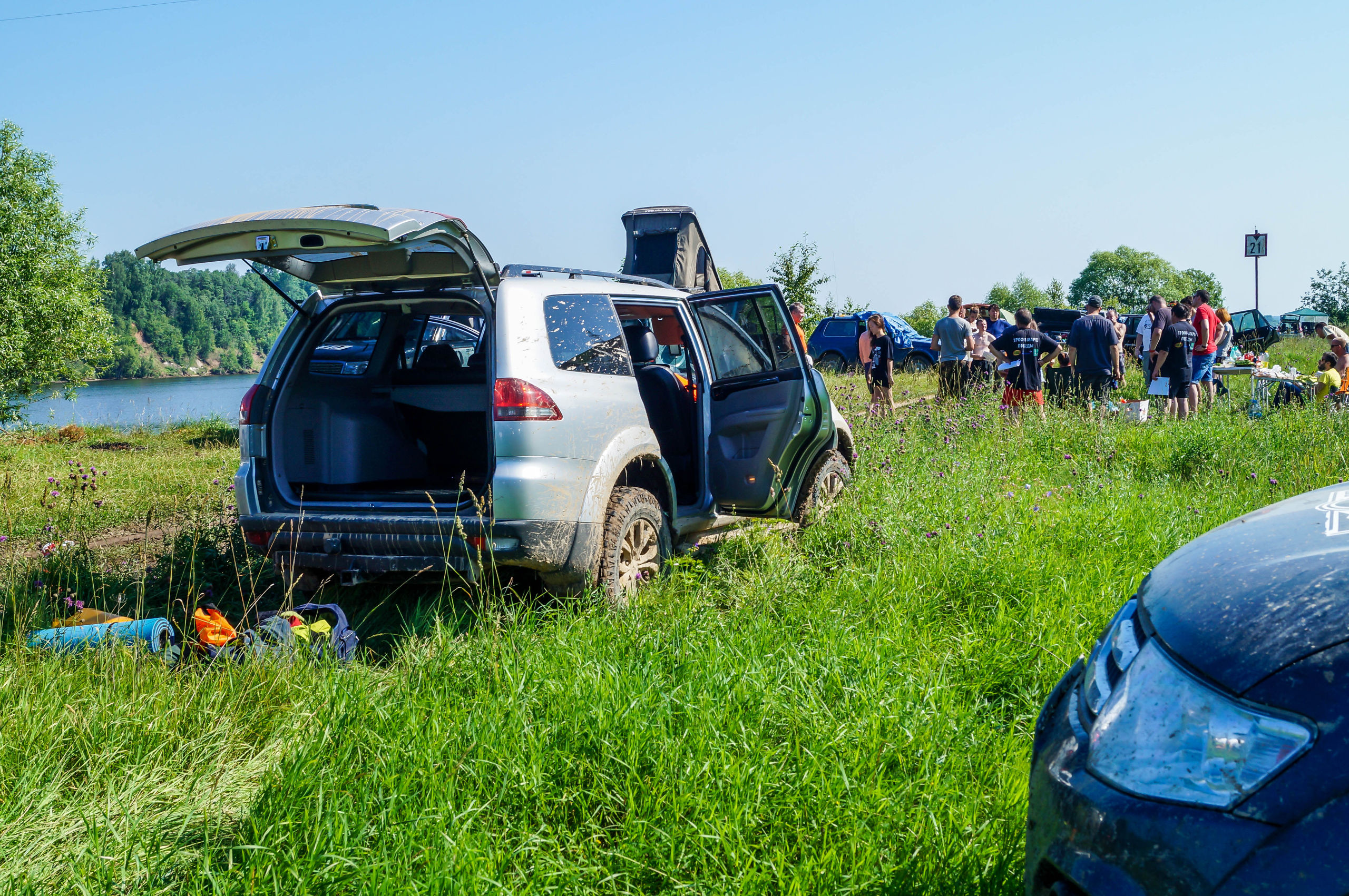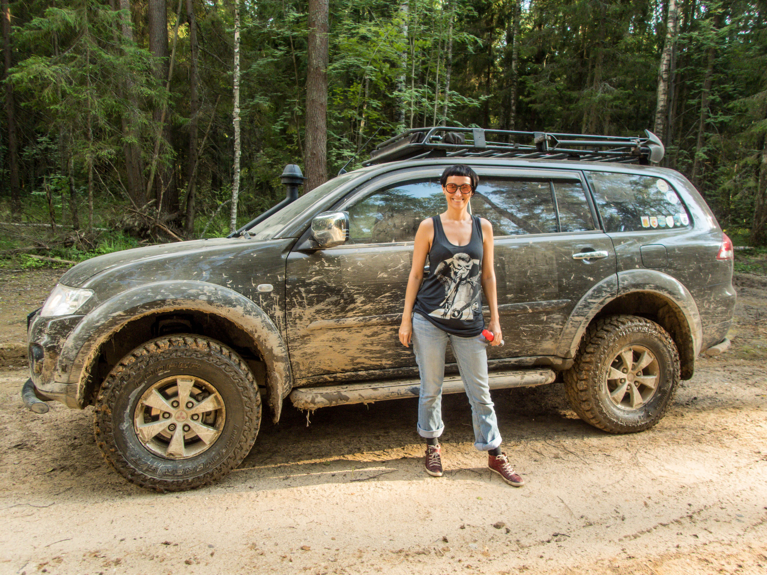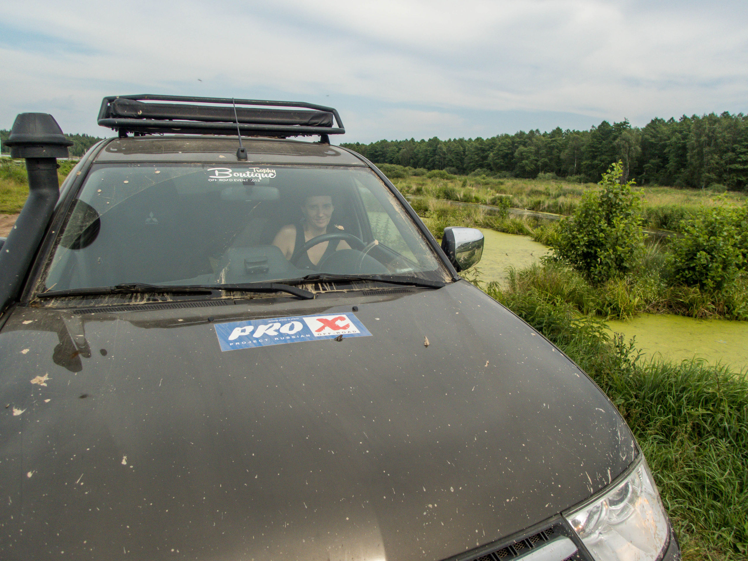После ручья немного расслабились на грунтовке и чуть не сделали «уши» на ровном месте. Хорошо облокотились на деревья багажником на крыше. А дальше аккуратненько вернулись на дорогу.